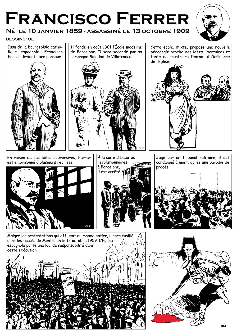 Issu de la bourgeoisie catholique espagnole, Francisco Ferrer devient libre penseur. Il fonde en août 1901 l’École moderne de Barcelone. Il sera secondé par sa compagne Soledad de Villafranca. Cette école, mixte, propose une nouvelle pédagogie proche des idées libertaires et tente de soustraire l’enfant à l’influence de l’Église.