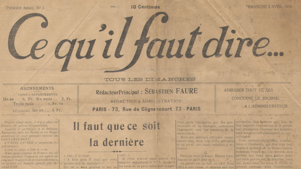 Le 2 avril 1916, Sébastien Faure lance avec l’aide de Mauricius le premier numéro de Ce qu’il faut dire. Cet hebdomadaire pacifiste de 4 pages grand format va atteindre assez rapidement, en pleine Première Guerre mondiale, un tirage de 20 000 exemplaires et 2 000 abonnés. Il paraîtra pendant deux ans, sauf une suspension de deux mois (juillet-août 1917) imposée par la censure, jusqu’à sa suspension définitive fin décembre 1917.