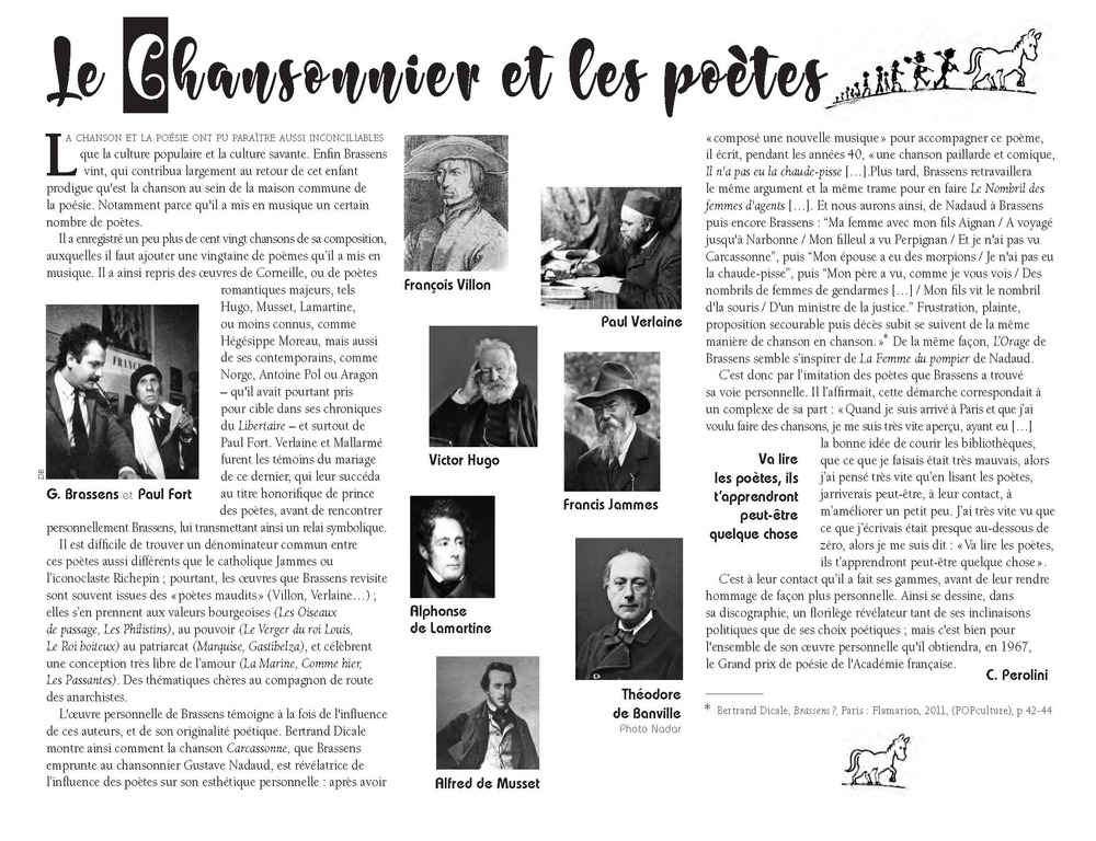 La chanson et la poésie ont pu paraître aussi inconciliables que la culture populaire et la culture savante. Enfin Brassens vint, qui contribua largement au retour de cet enfant prodigue qu’est la chanson au sein de la maison commune de la poésie. Notamment parce qu’il a mis en musique un certain nombre de poètes.