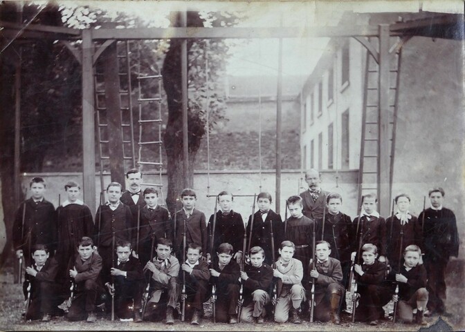 École Pellerin à Beauvais (Oise) vers 1890. Le bataillon scolaire en exercice dans la cour de récréation.