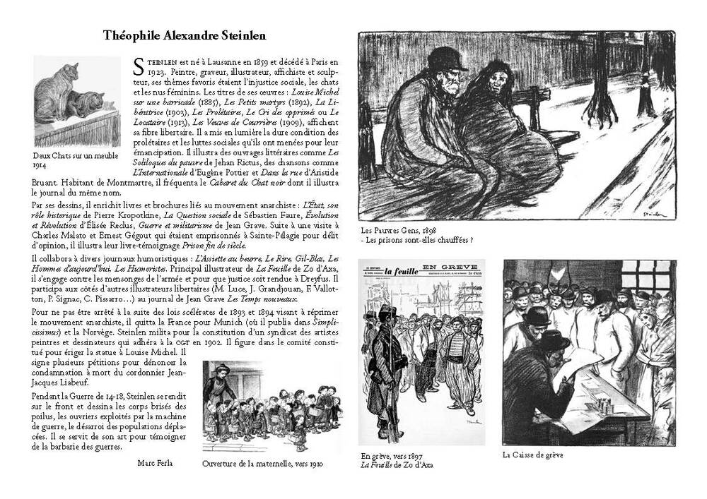 Steinlen est né à Lausanne en 1859 et décédé à Paris en 1923. Peintre, graveur, illustrateur, affichiste et sculpteur, ses thèmes favoris étaient l’injustice sociale, les chats et les nus féminins. Les titres de ses œuvres : Louise Michel sur une barricade (1885), Les Petits martyrs (1892), La Libératrice (1903), Les Prolétaires, Le Cri des opprimés ou Le Locataire (1913), Les Veuves de Courrières (1909), affichent sa fibre libertaire. Il a mis en lumière la dure condition des prolétaires et les luttes sociales qu’ils ont menées pour leur émancipation. Il illustra des ouvrages littéraires comme Les Soliloques du pauvre de Jehan Rictus, des chansons comme L’Internationale d’Eugène Pottier et Dans la rue d’Aristide Bruant. Habitant de Montmartre, il fréquenta le Cabaret du Chat noir dont il illustra le journal du même nom.